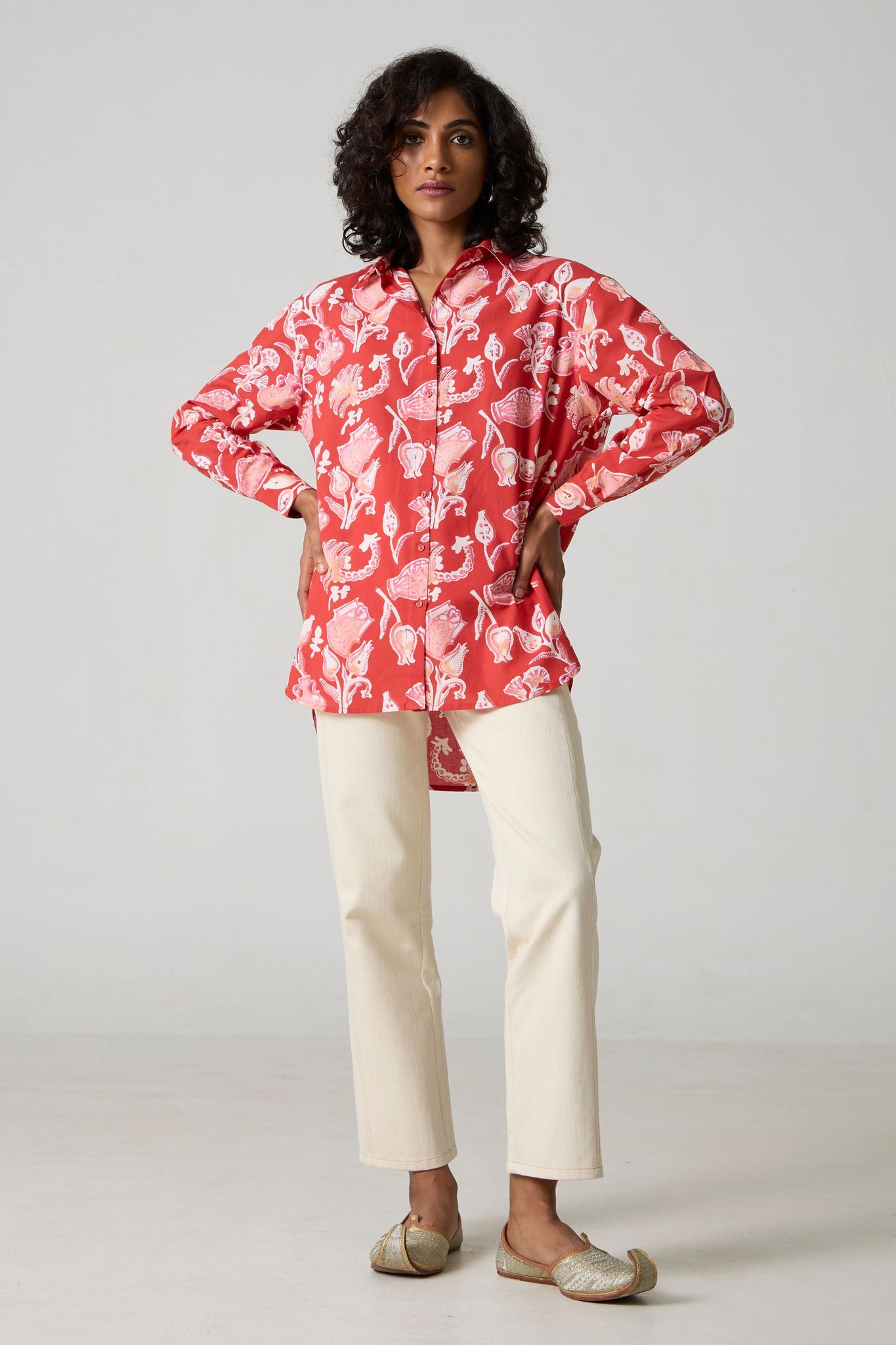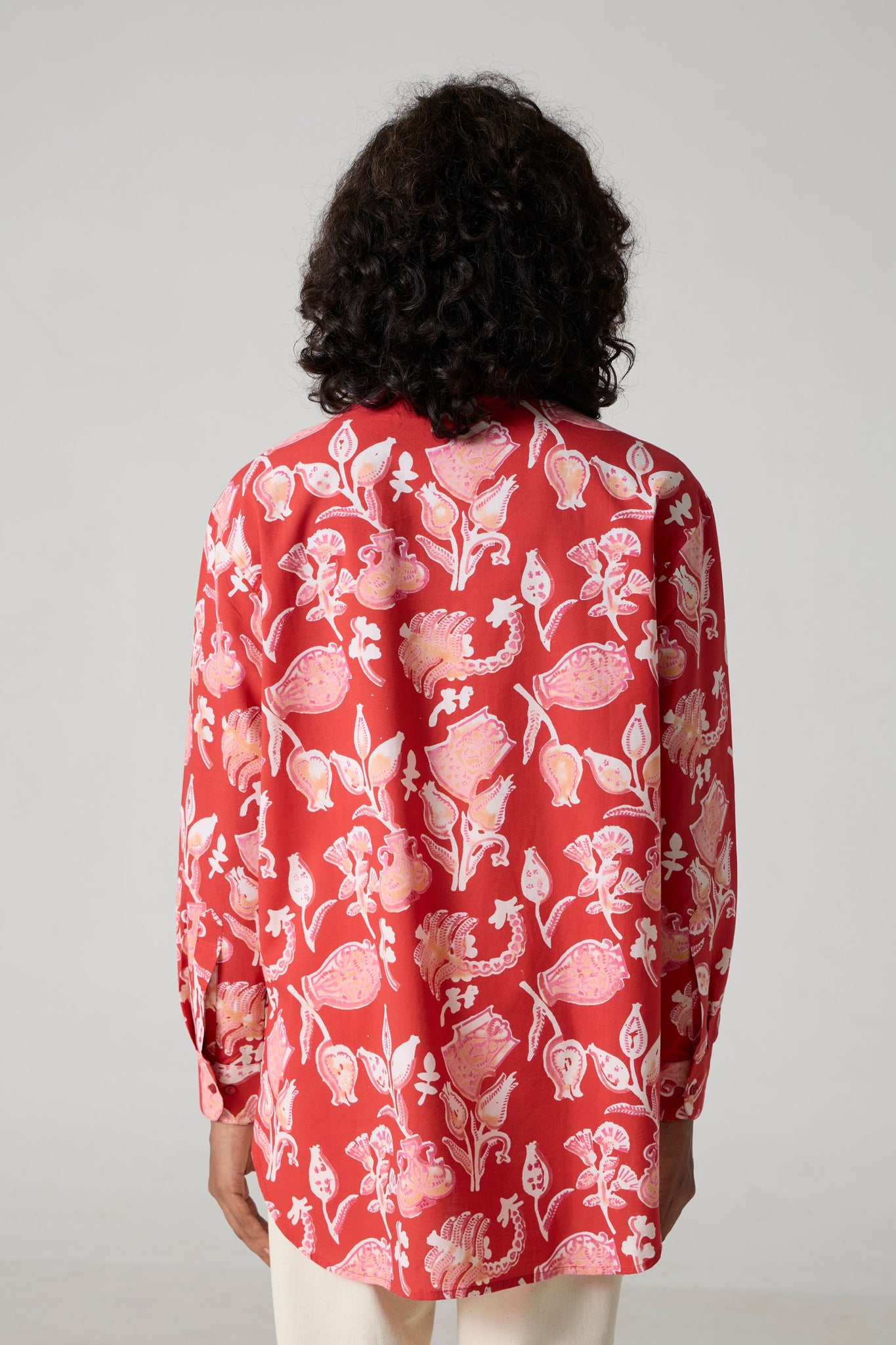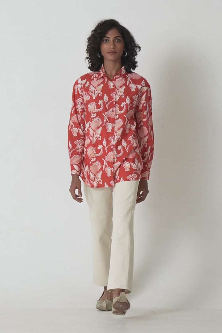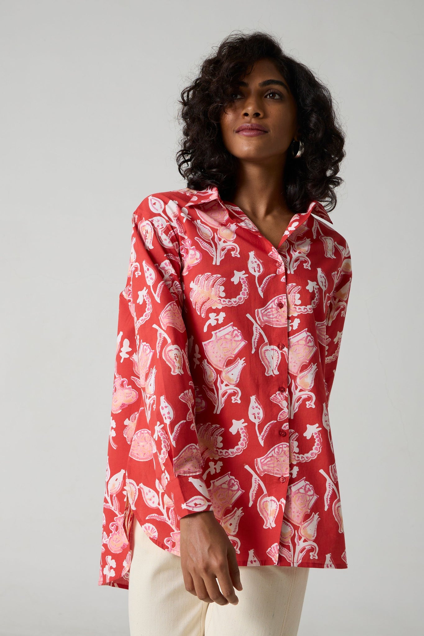 An oversized shirt for busy days on the move. Crafted in soft hand block-printed fabric. High-low hem, classic shirt collar, bracelet length sleeves.