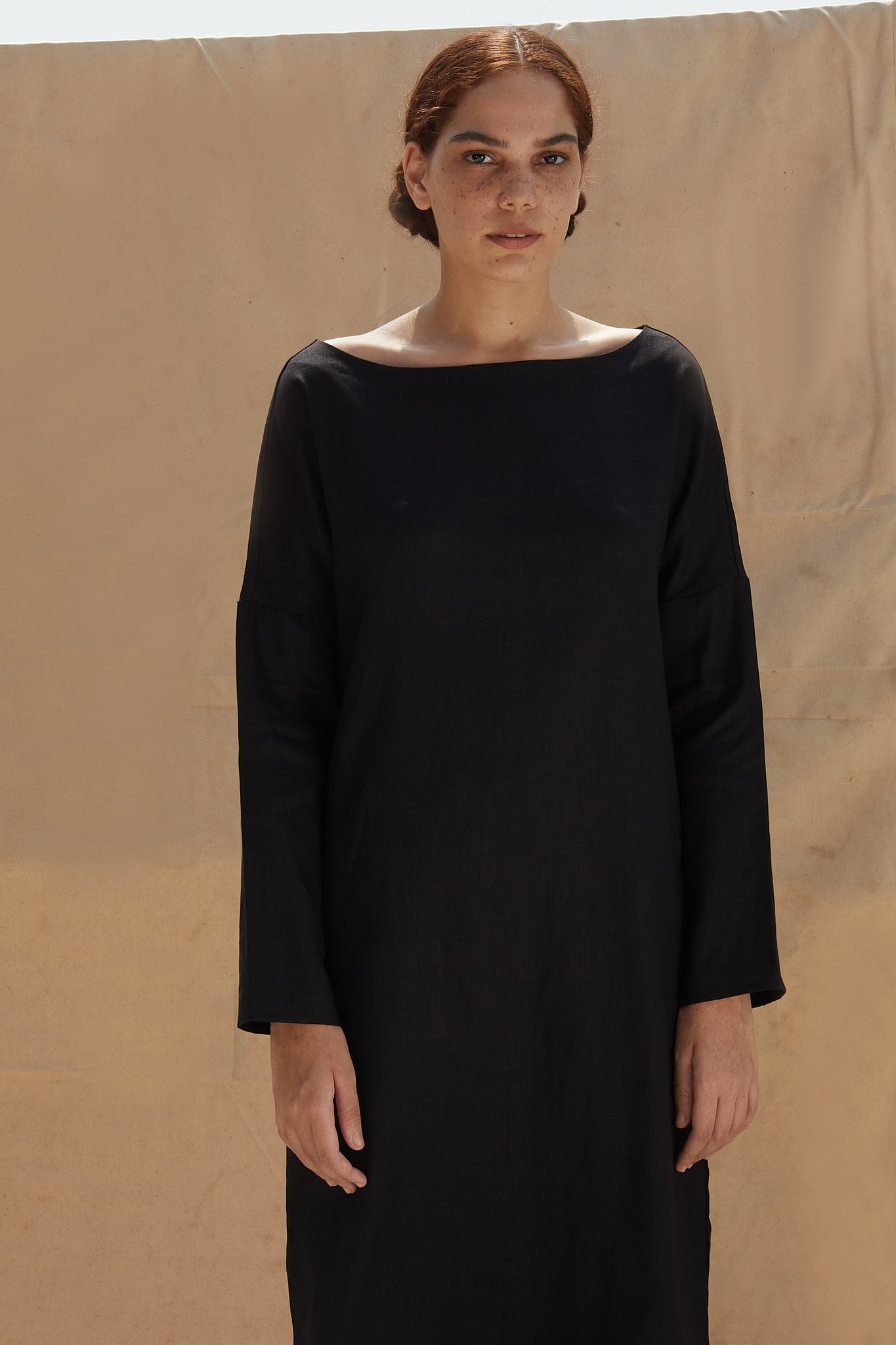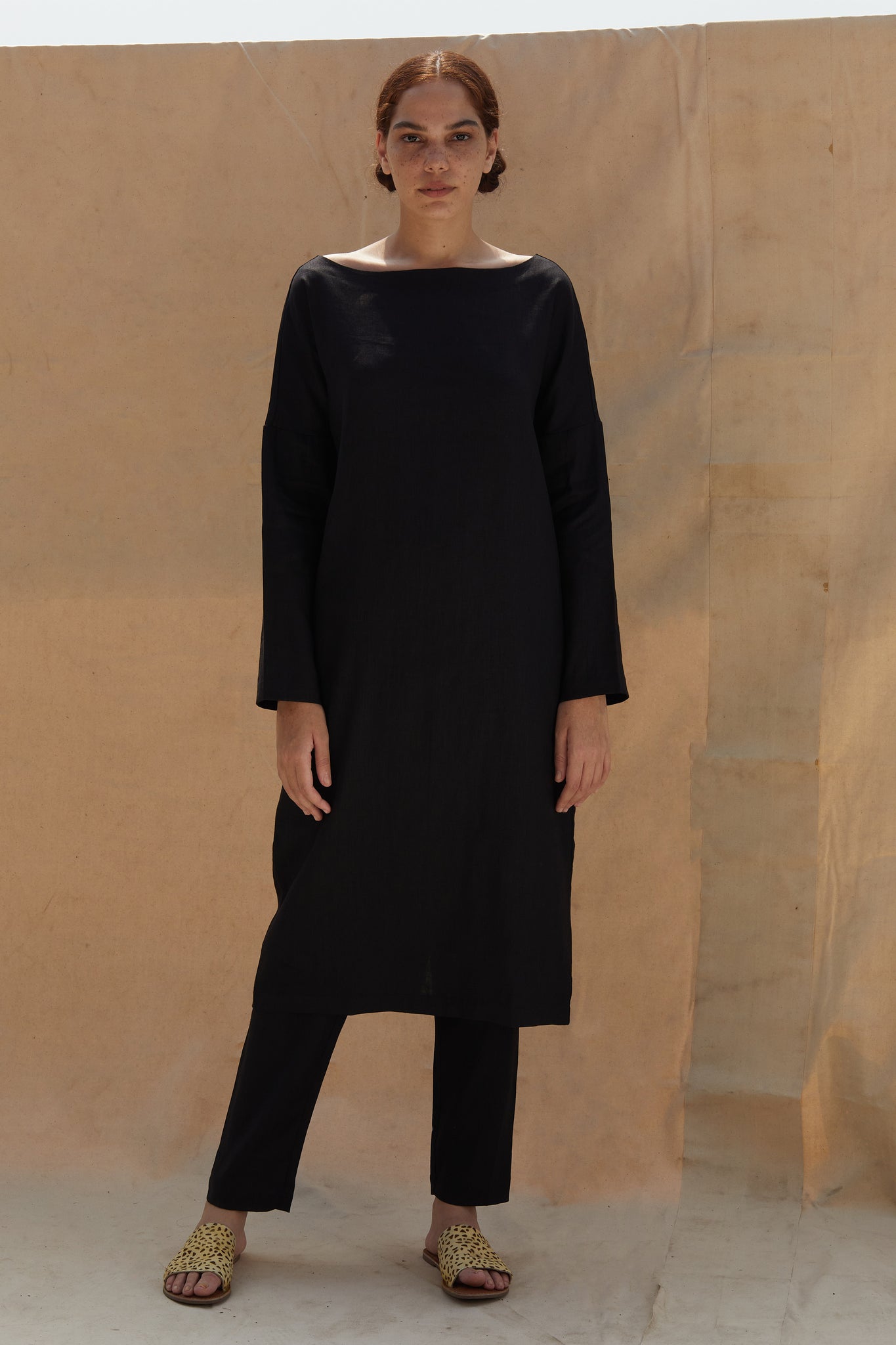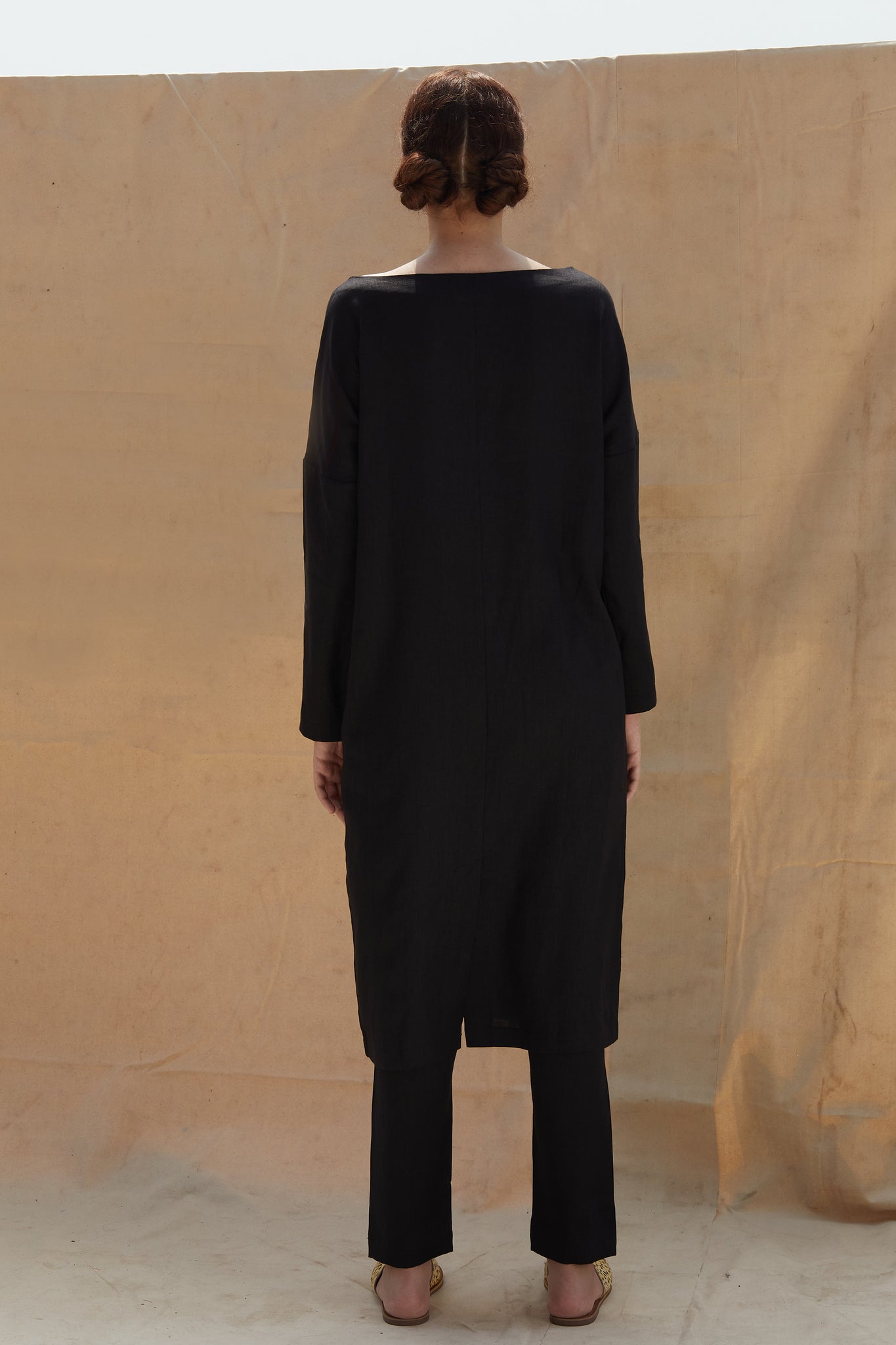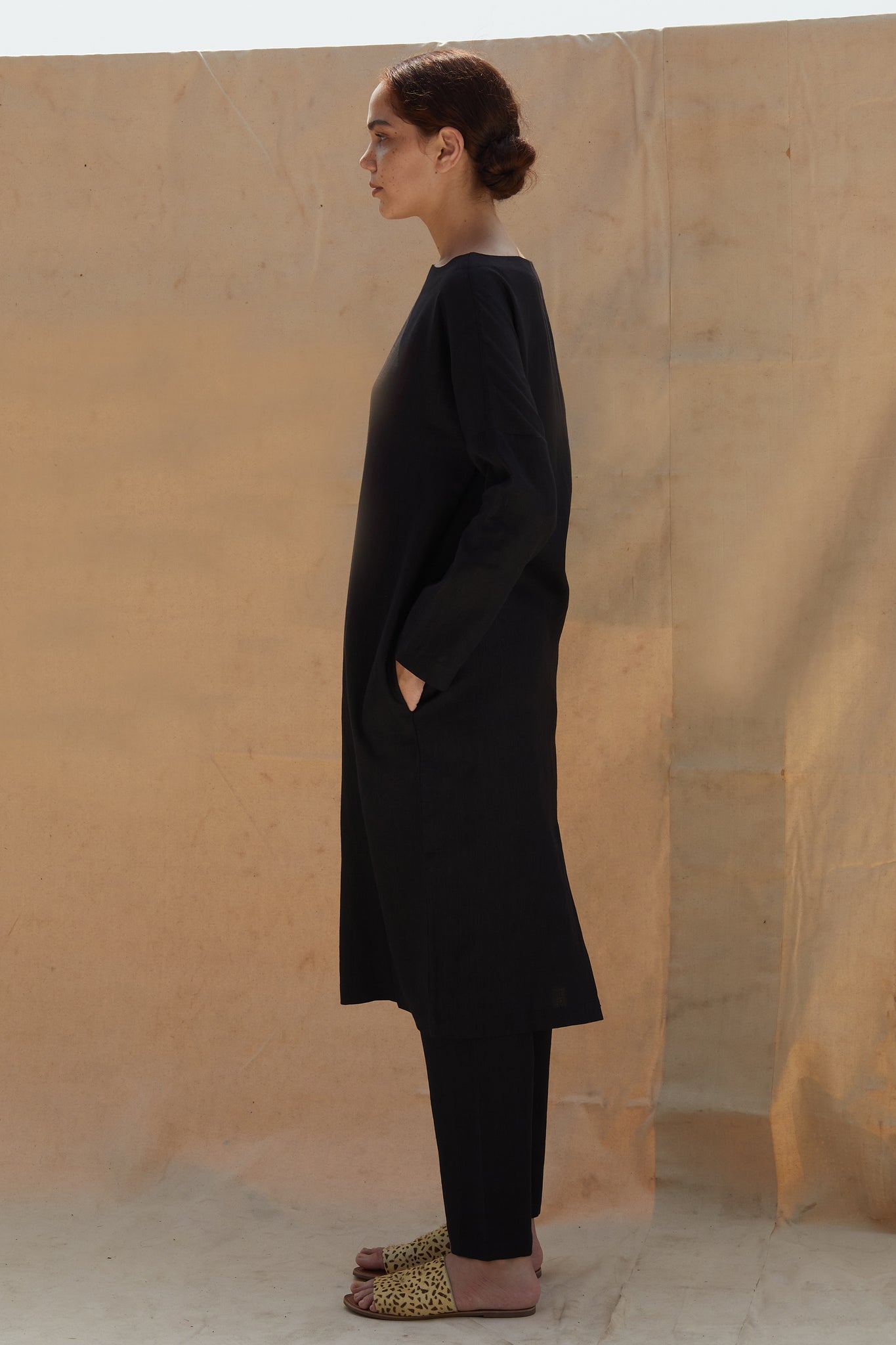 A handsome shift dress with a wide boat neck. Full length sleeves. Overlap slit in the back for ease of movement. In-seam pockets. The dress comes with an optional fabric belt. The dress is paired with these elasticated pants.