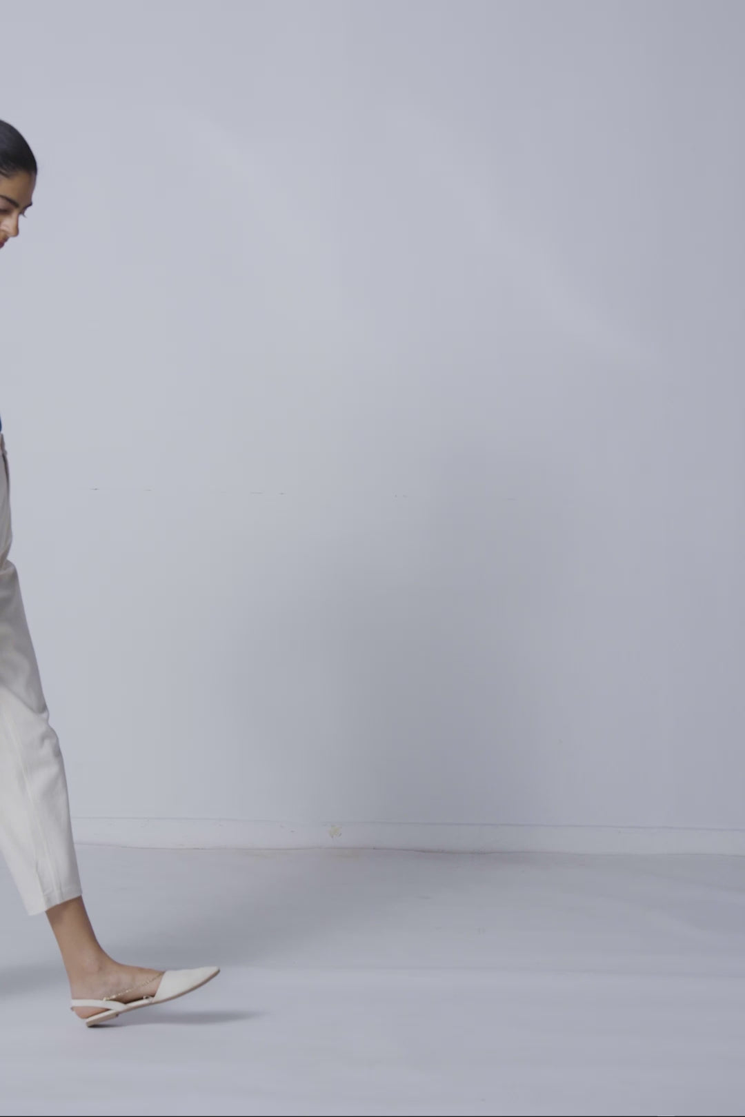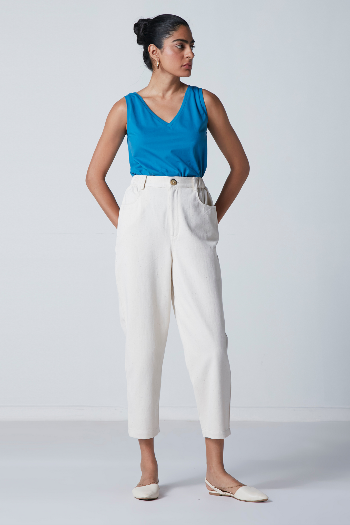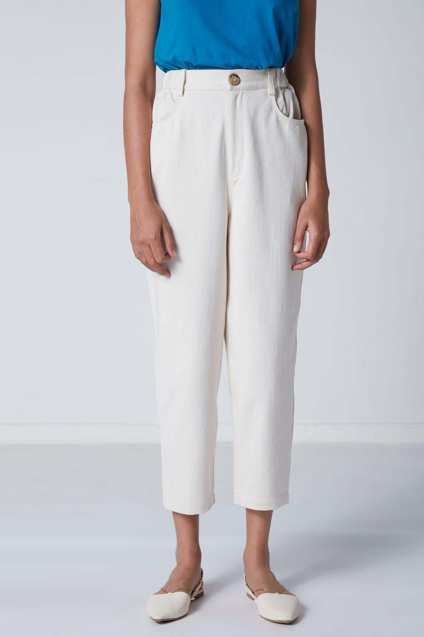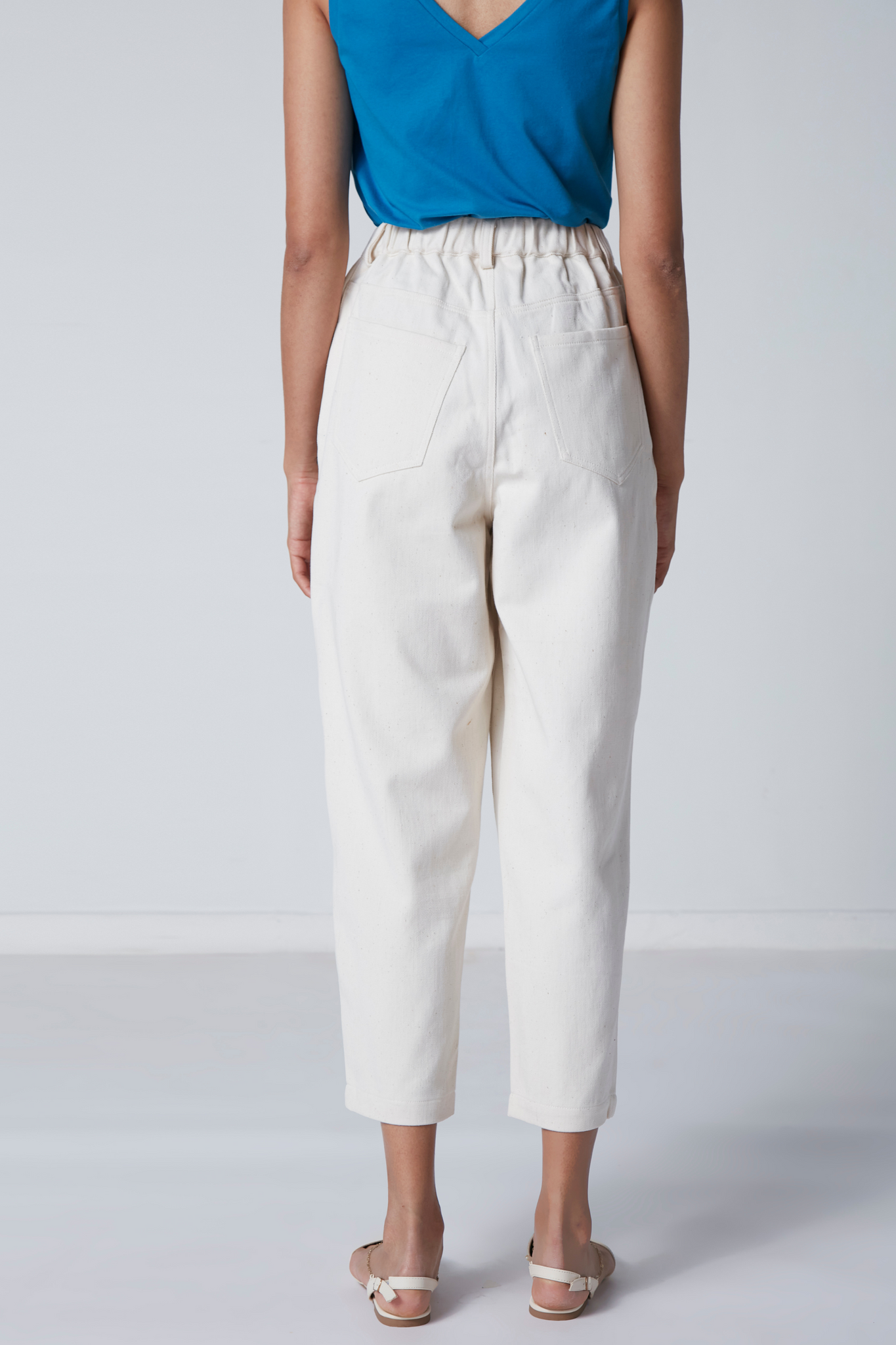 Handwoven, dye free denim. High rise with ankle grazing length. Elasticated waist. Front button fastening with a zip fly.