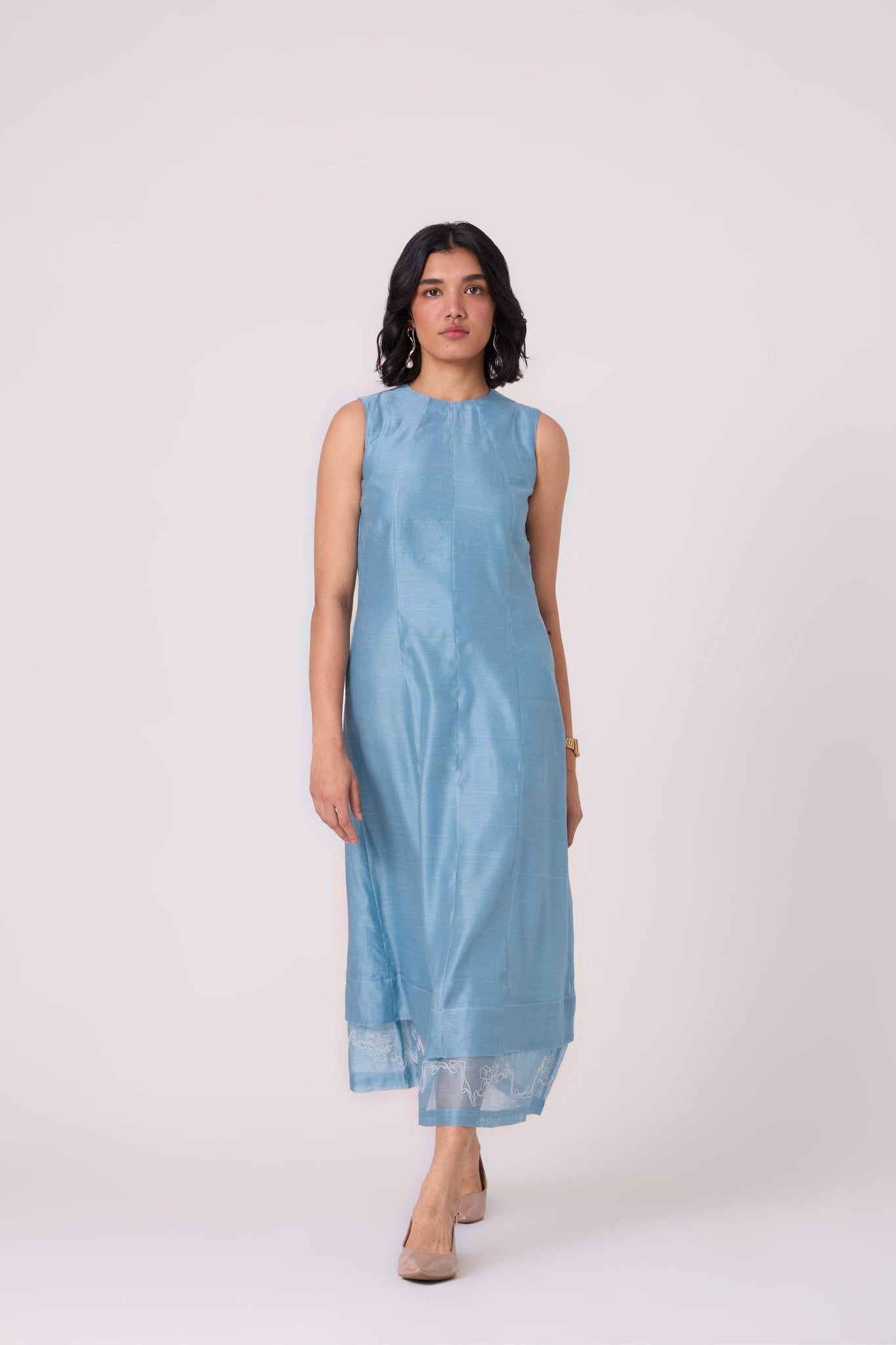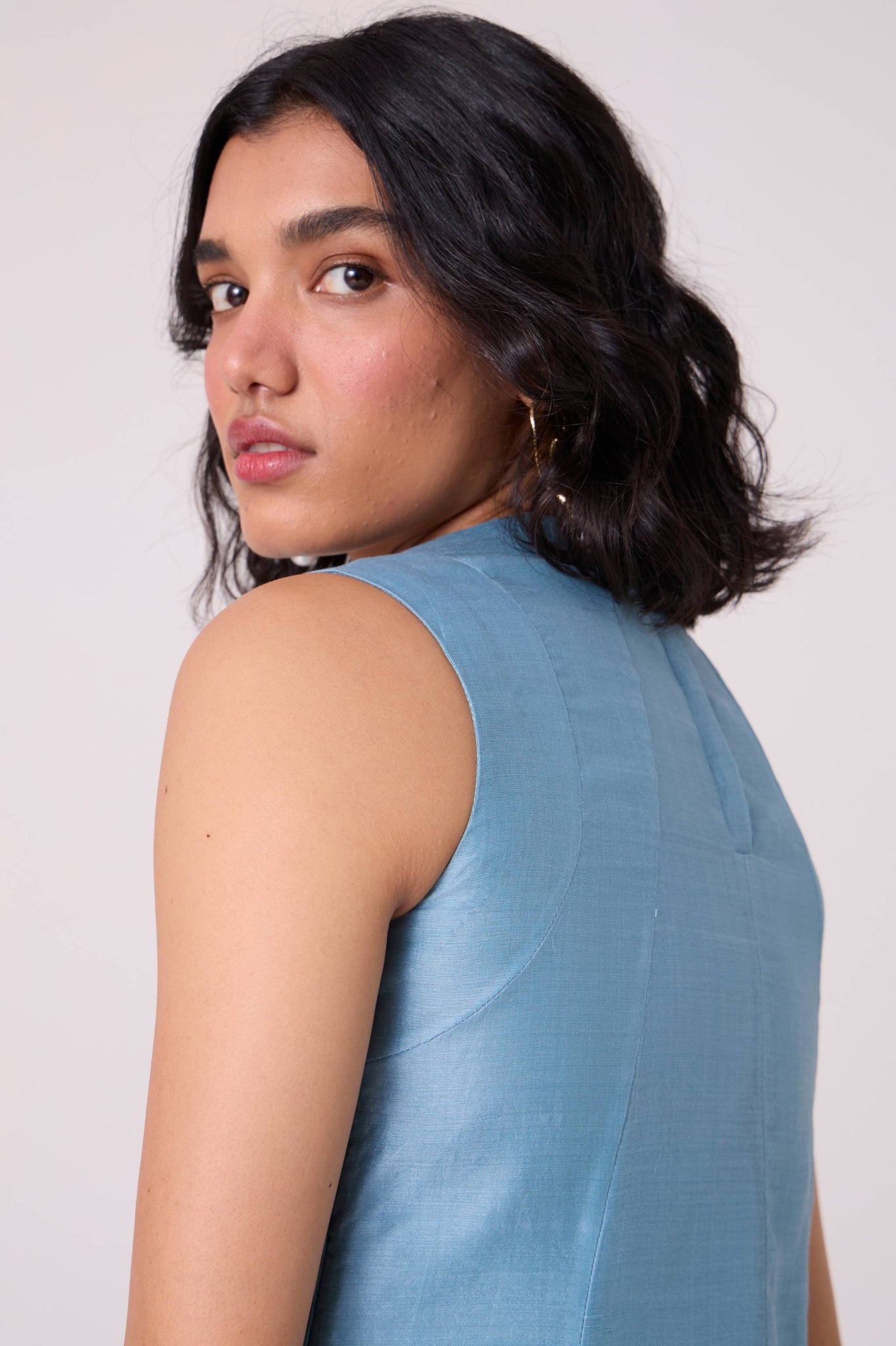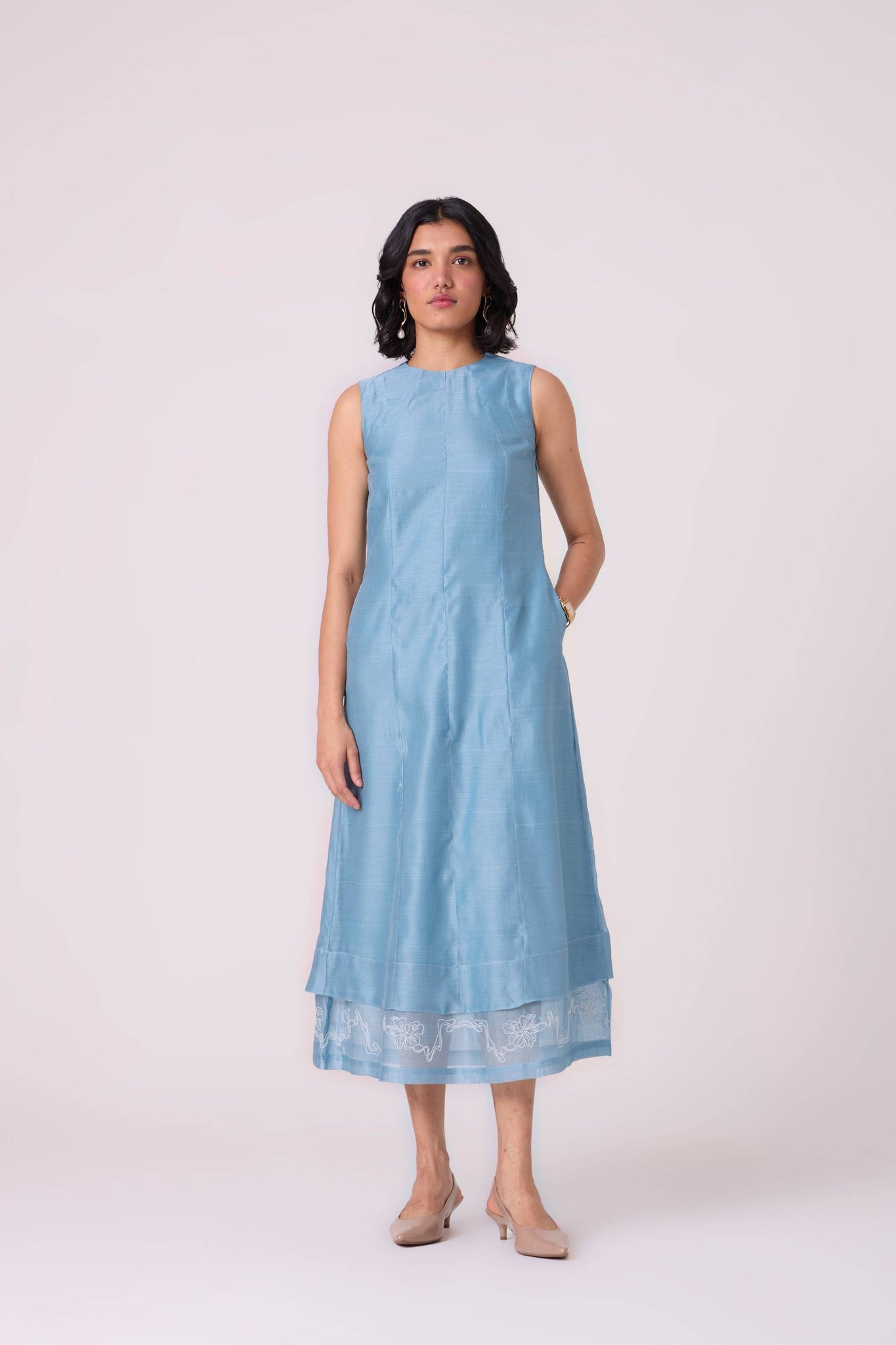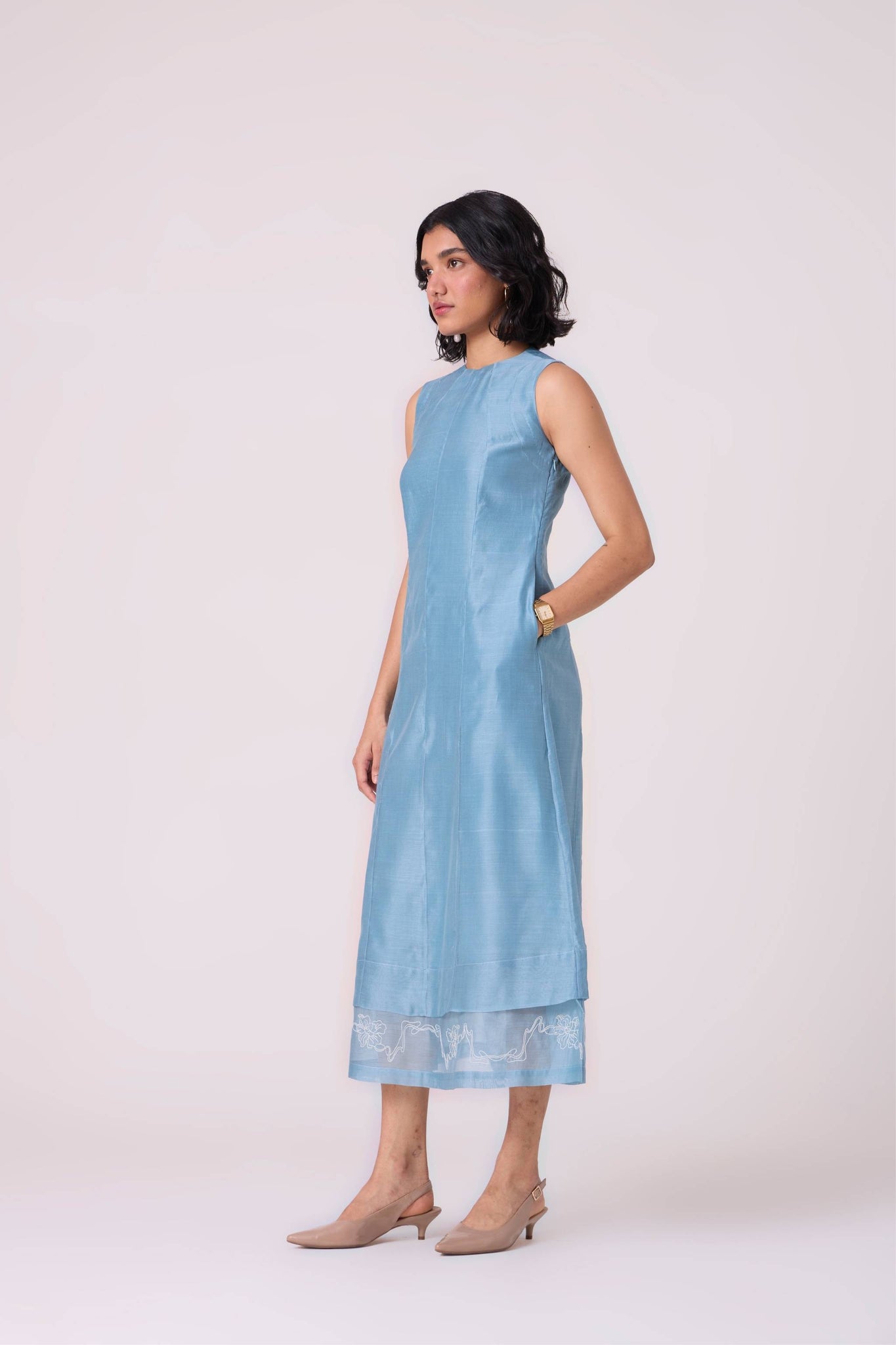 Panels sculpt a clean sleeveless line before opening into a double-layered hem. The inner edge, embroidered by hand, reveals its artistry only in movement.