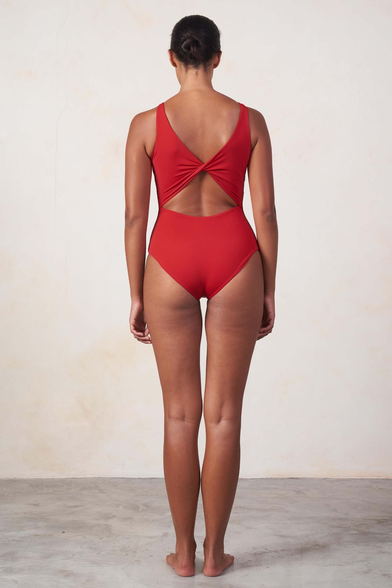 Scoop neck swimsuit with a twisted back detail. Removable padding.