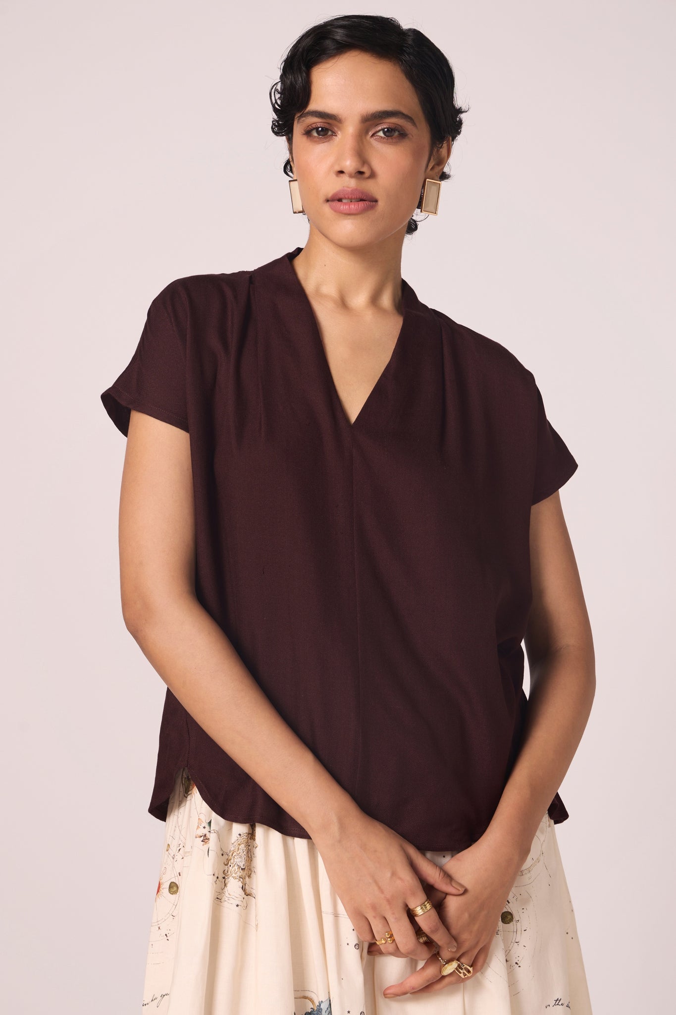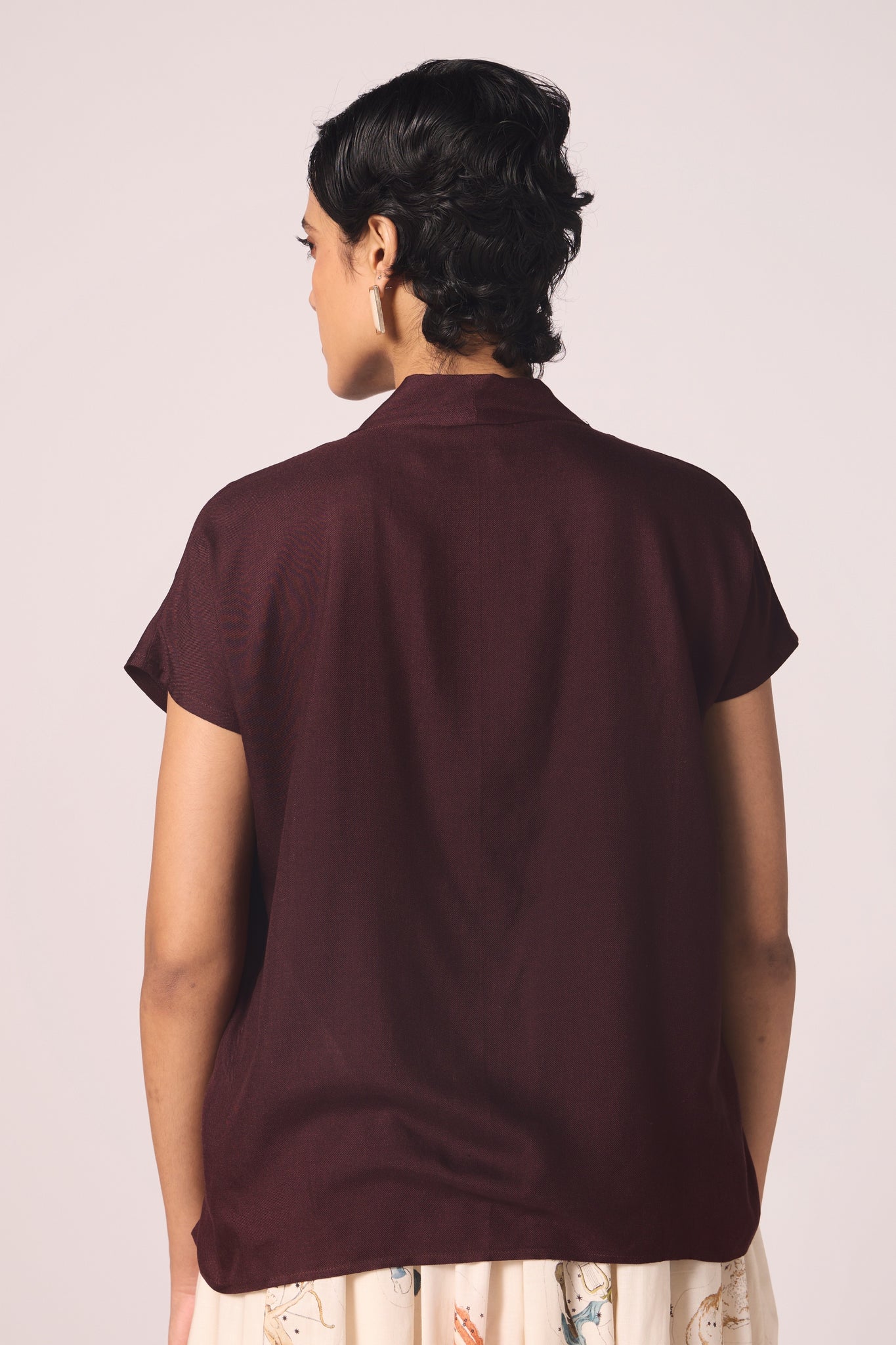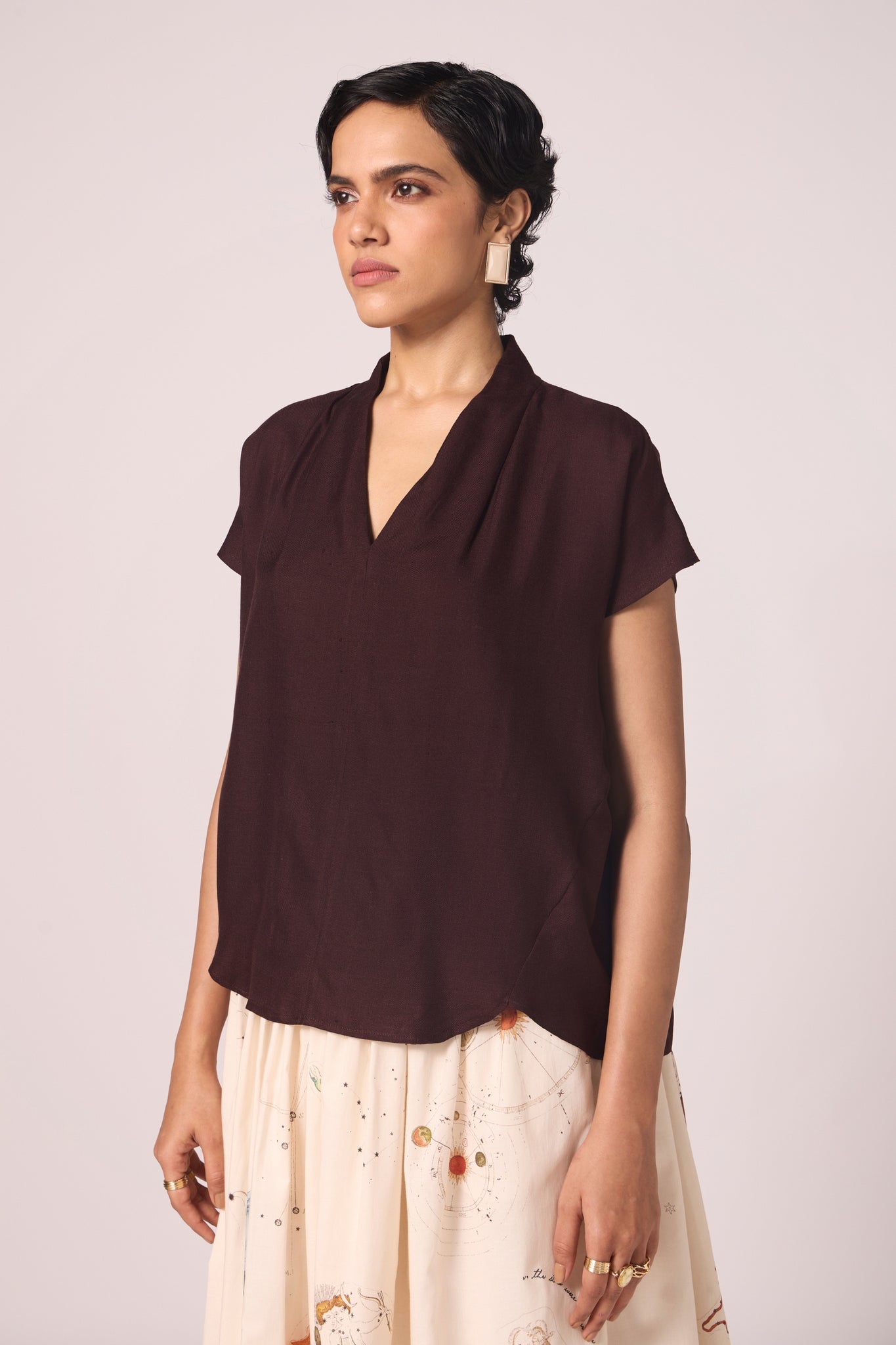 The neckline opens into a soft V, framed by a pleated collar. Short sleeves balance the line, making this top an effortless piece that transitions with ease.