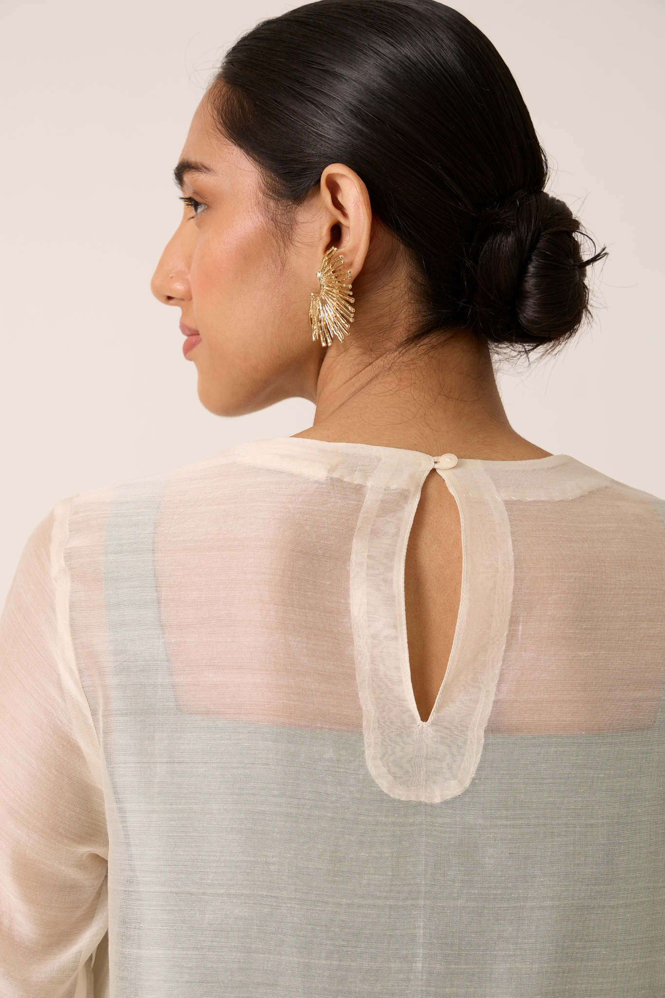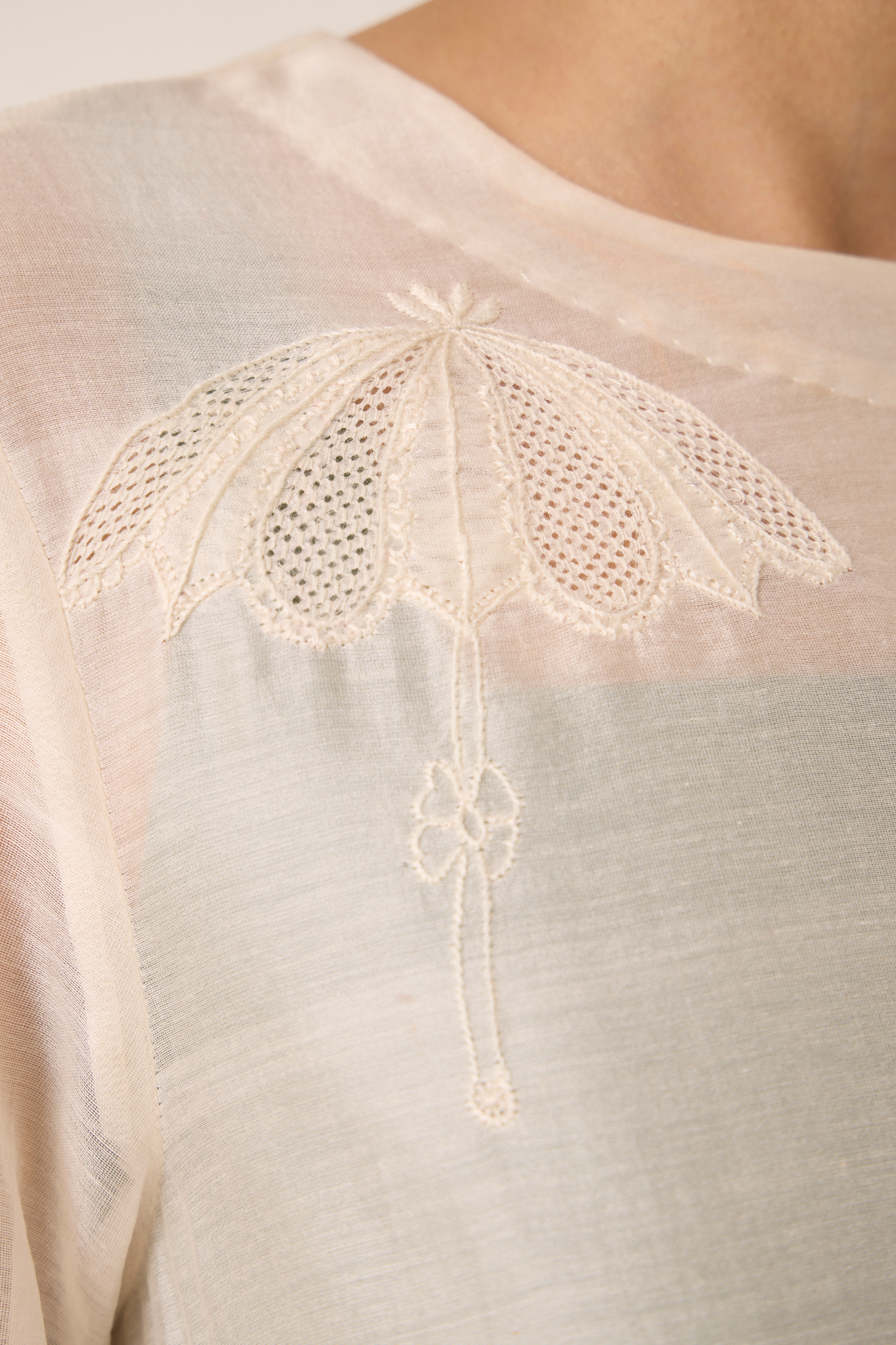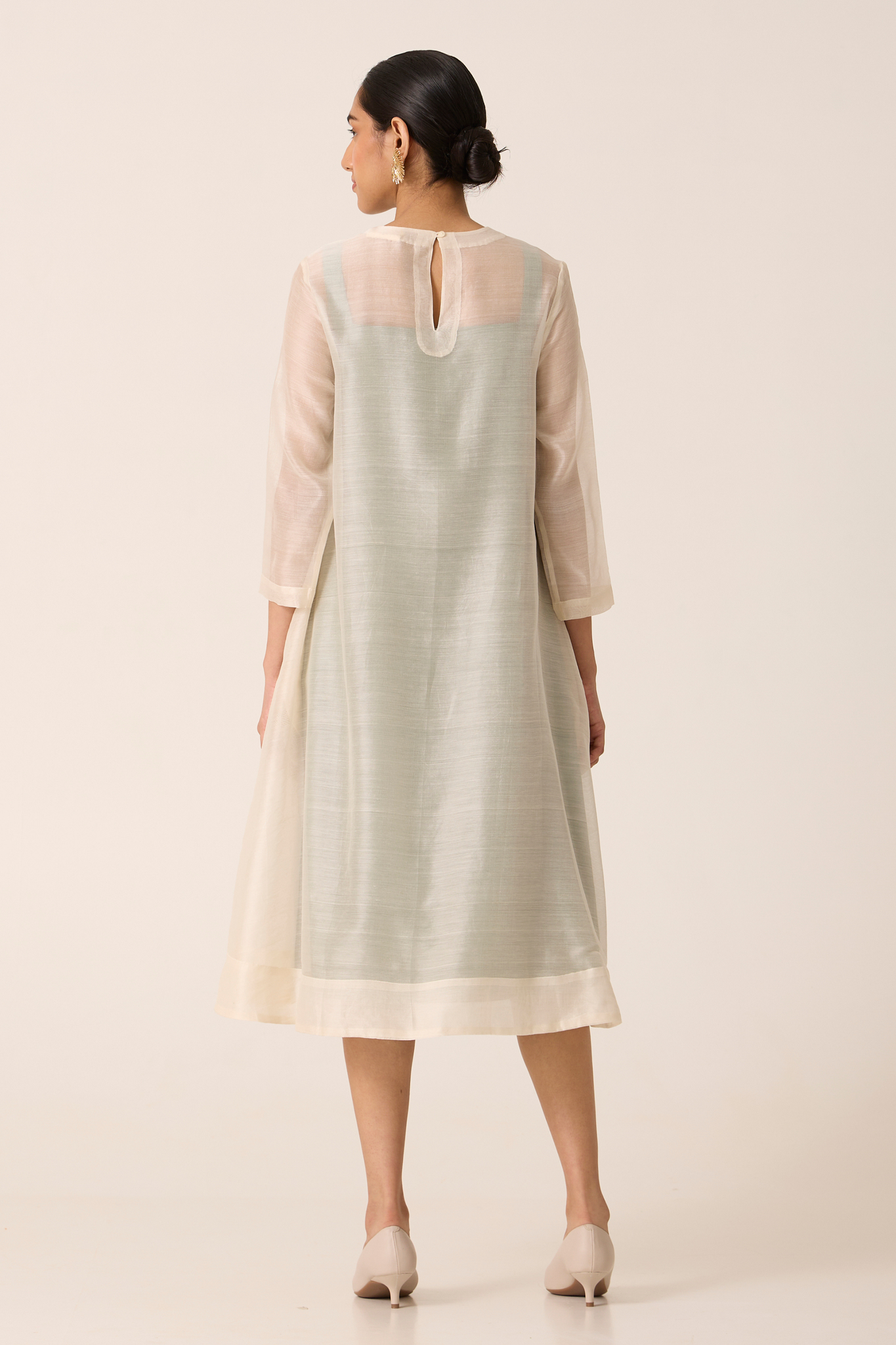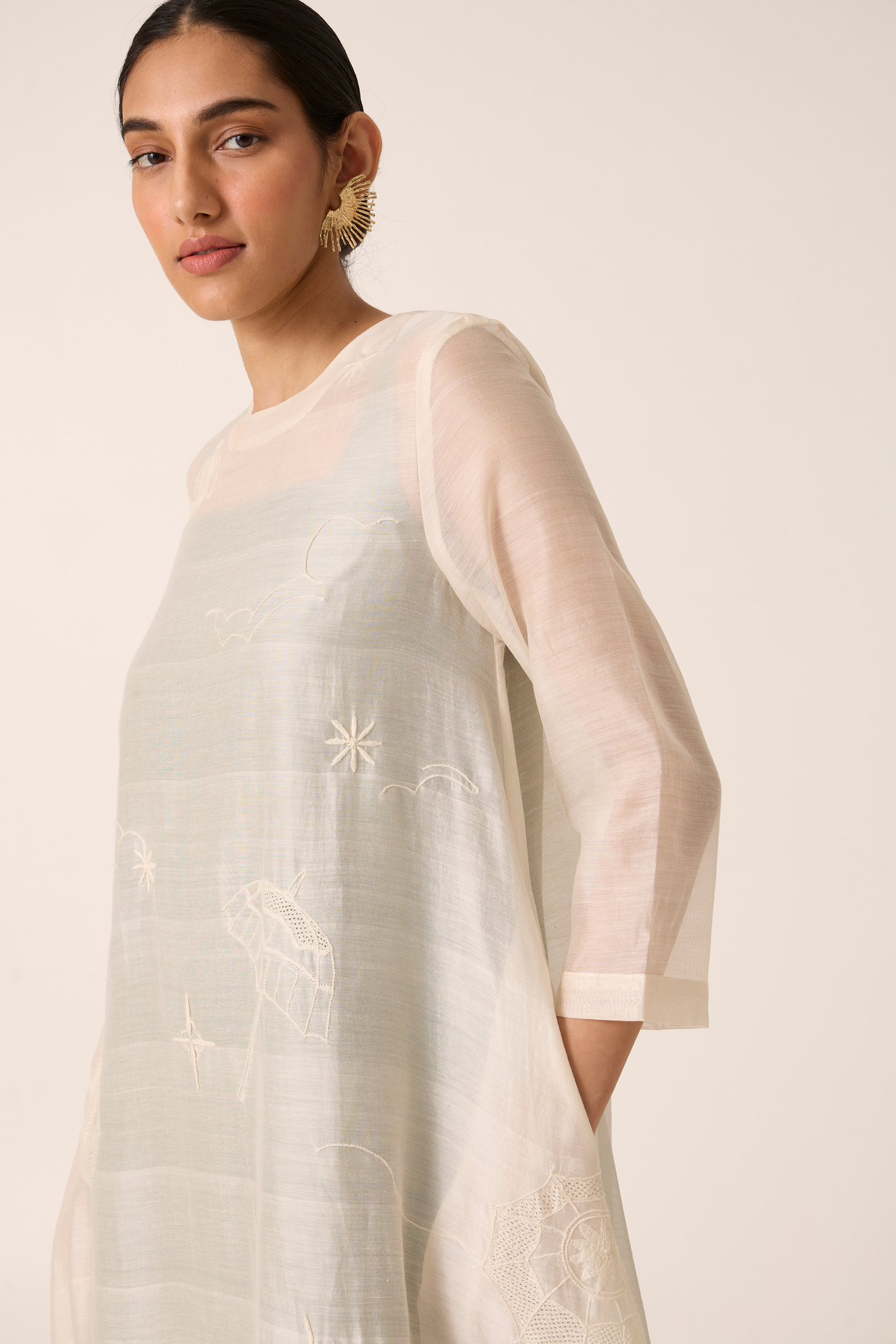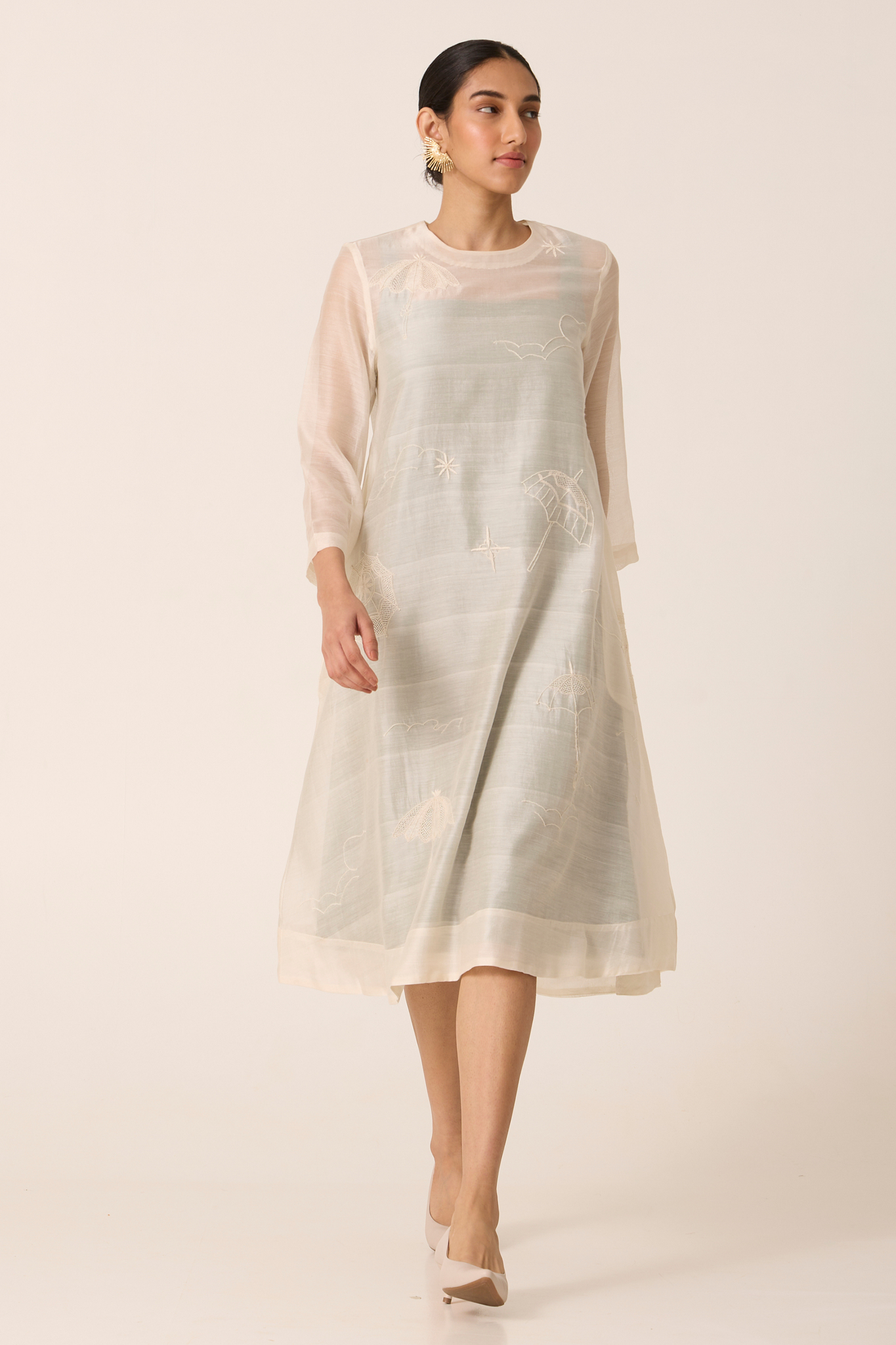 Handwoven Chanderi delicately embroidered with fine Chikankari. Dress layered over contrast slip for subtle drama. Three fourth length sleeves Rouleau button fastening.