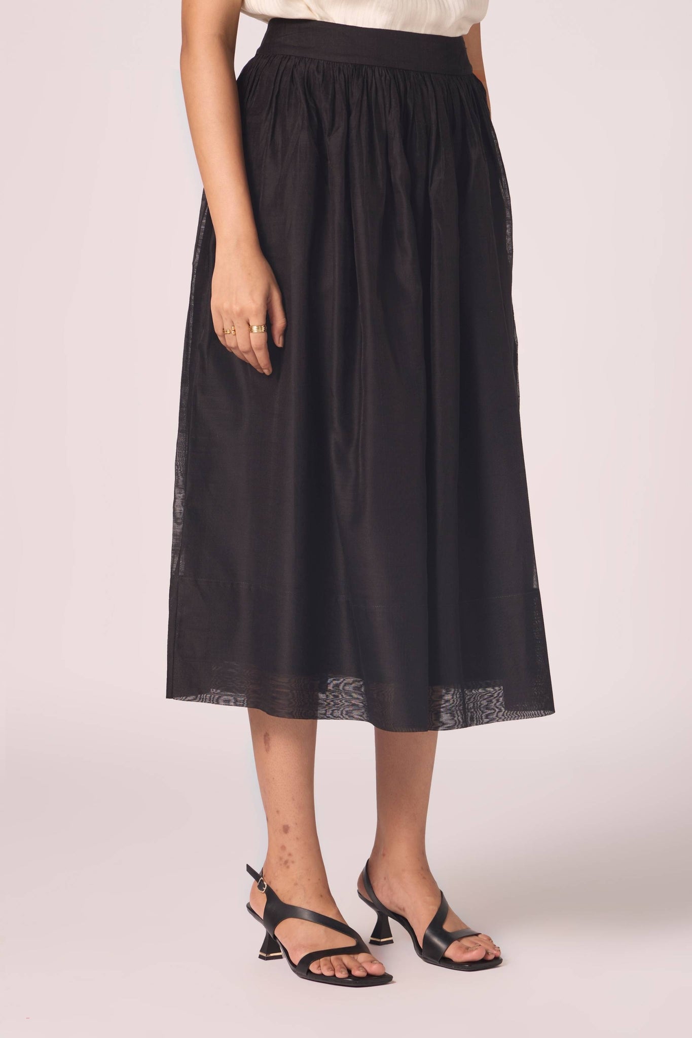 Handwoven Chanderi, this skirt gathers at the waist before flowing into measured fullness. Its construction ensures body and fall, while full lining lends depth to the silhouette.