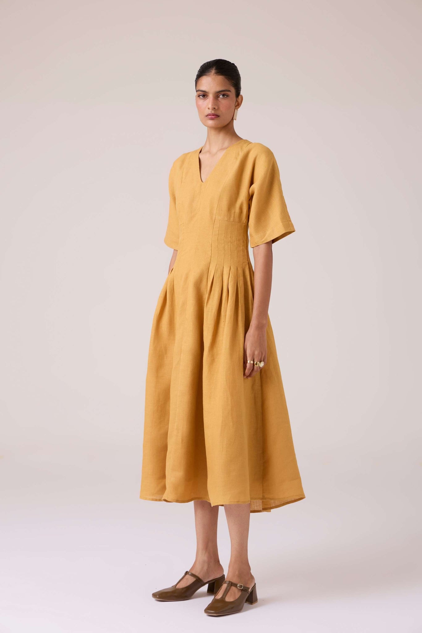 A dress that shapes itself to movement. The scoop neckline and pleated panels draw the waist in, while a generous flare opens with each step.