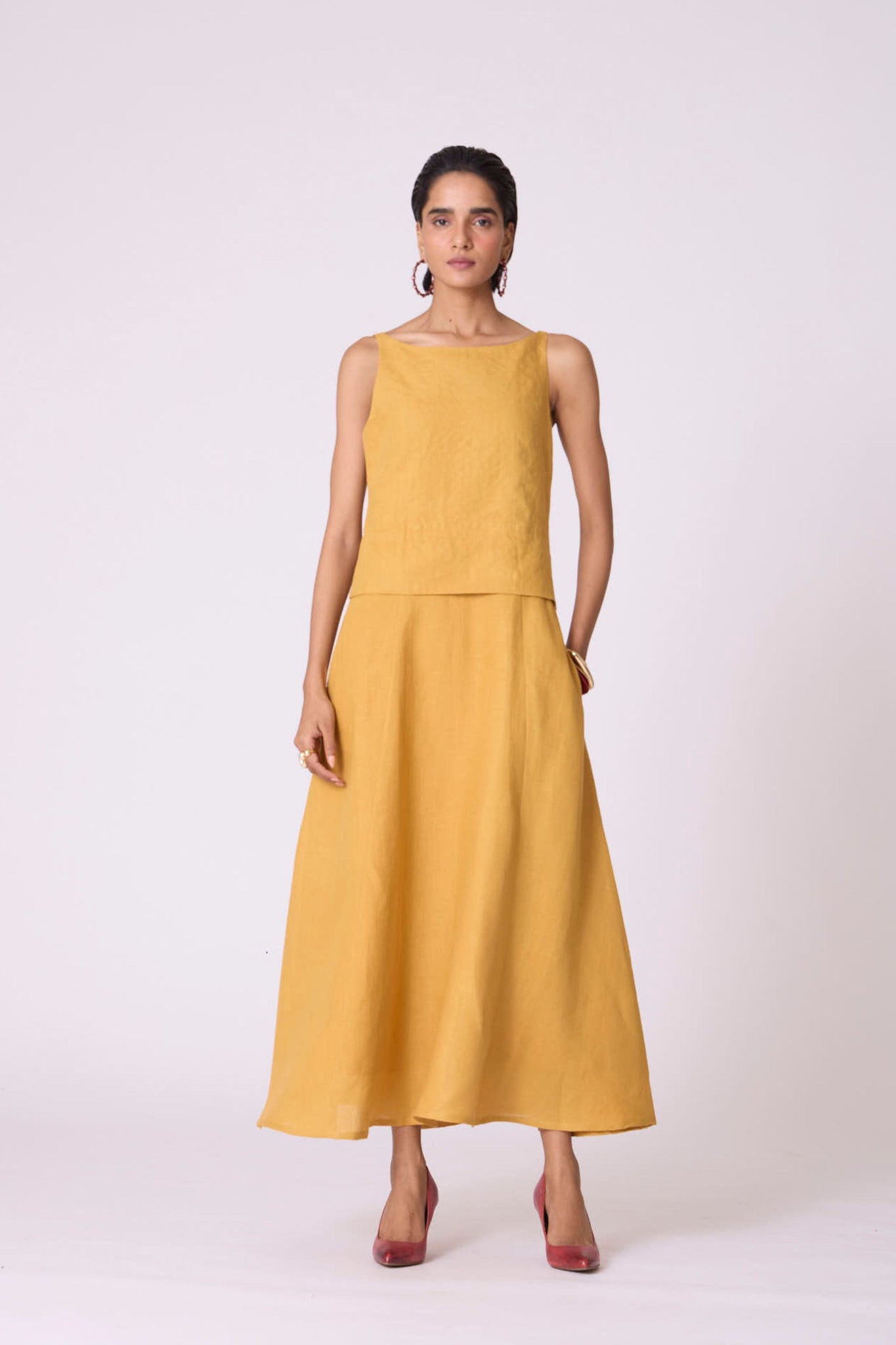 A quietly structured silhouette defined by a finely quilted low-waist yoke, the Senaka dress brings subtle dimension to linen. Its panelled hem and clean sleeveless form create an assured balance of lightness and shape.
