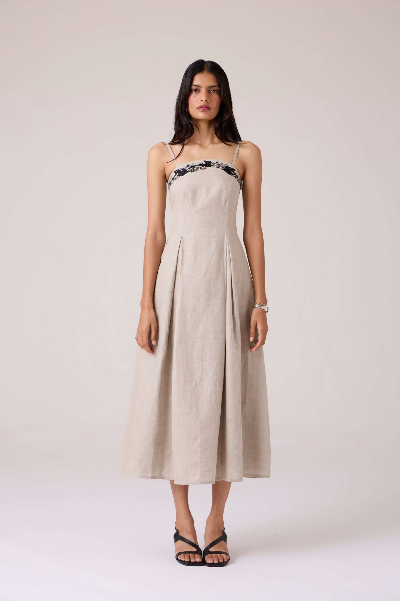 Sculpted yet easy. A tube dress marked by an embroidered neckline, smocked back, and detachable straps - balancing structure with freedom.