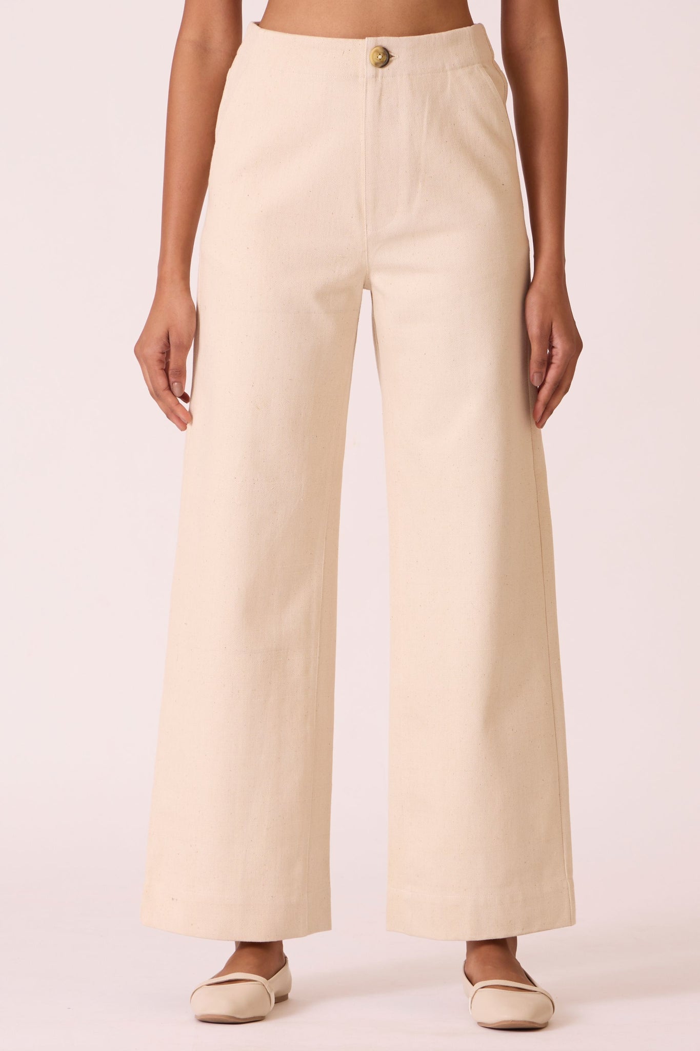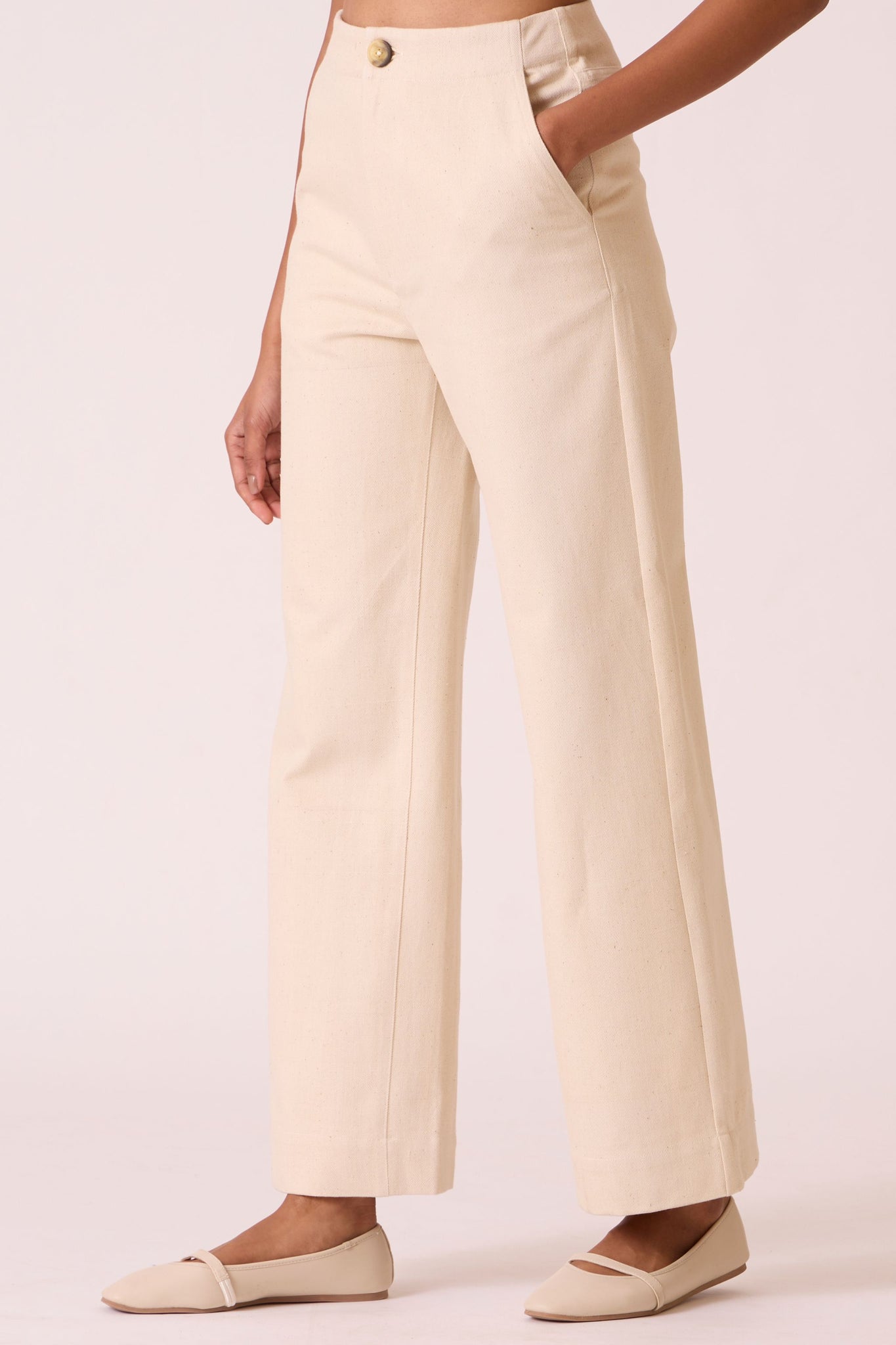 A straight leg mid rise pants with front fly button fastening and cross pockets.