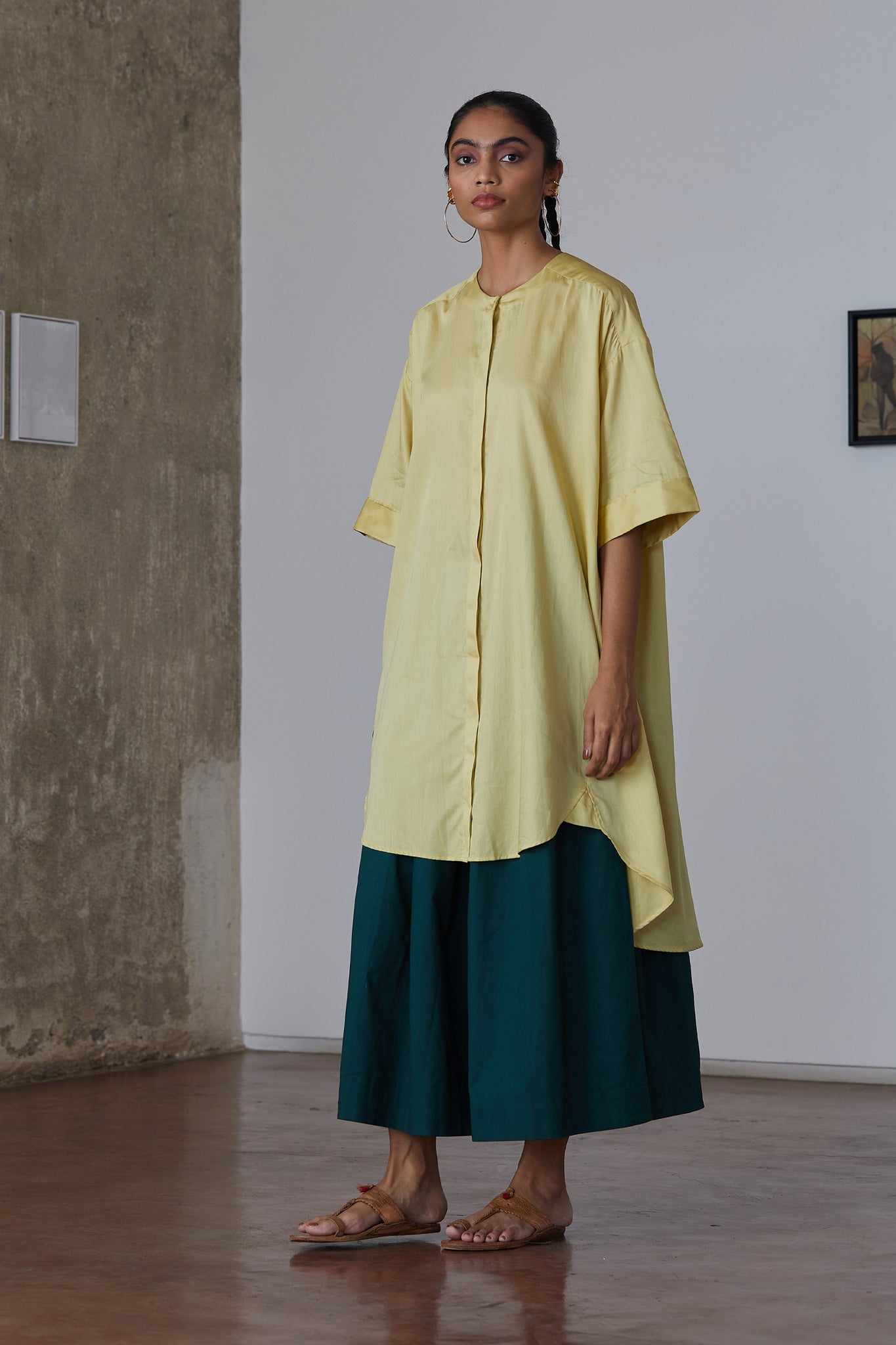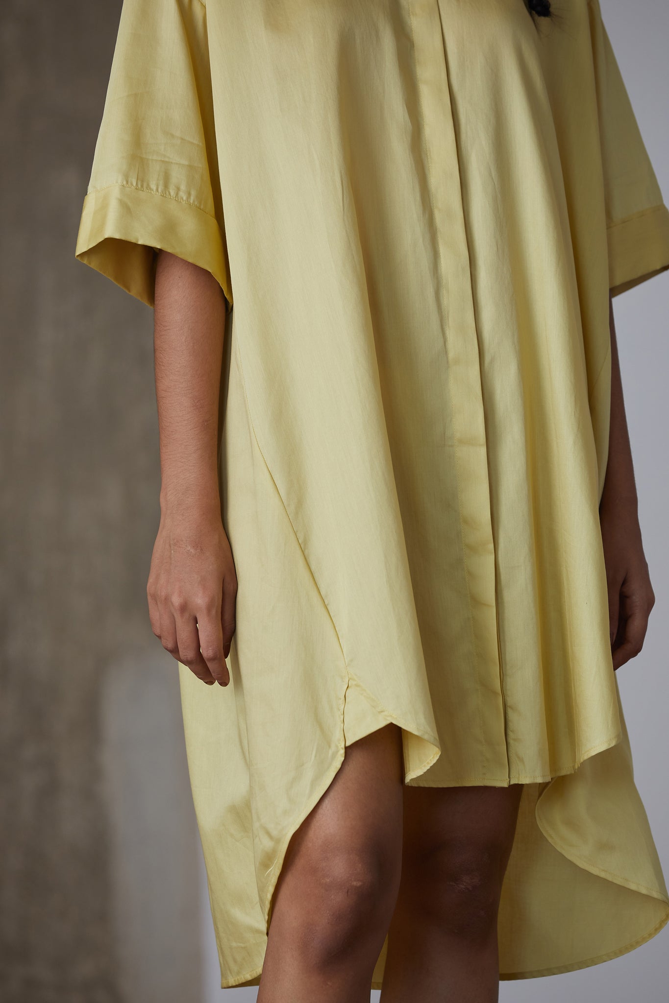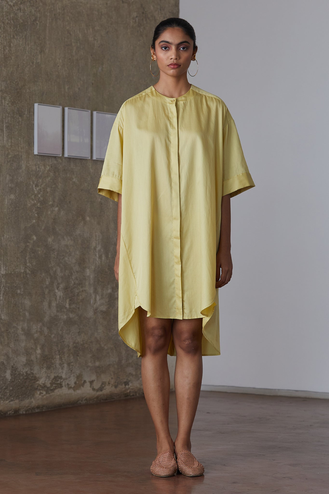 Anti-fit yet feminine dress. Boxy sleeves. Modish round neck. Curved hemline with gazette detail. Button through with neatly concealed placket. Back yoke with single a inverted pleat. Can be worn as is or paired with pants. Easy to style.