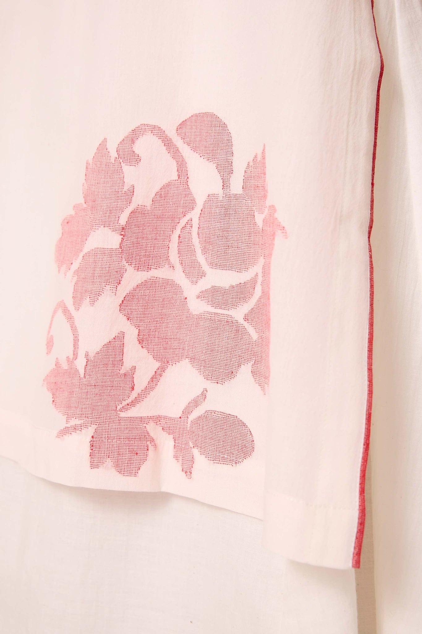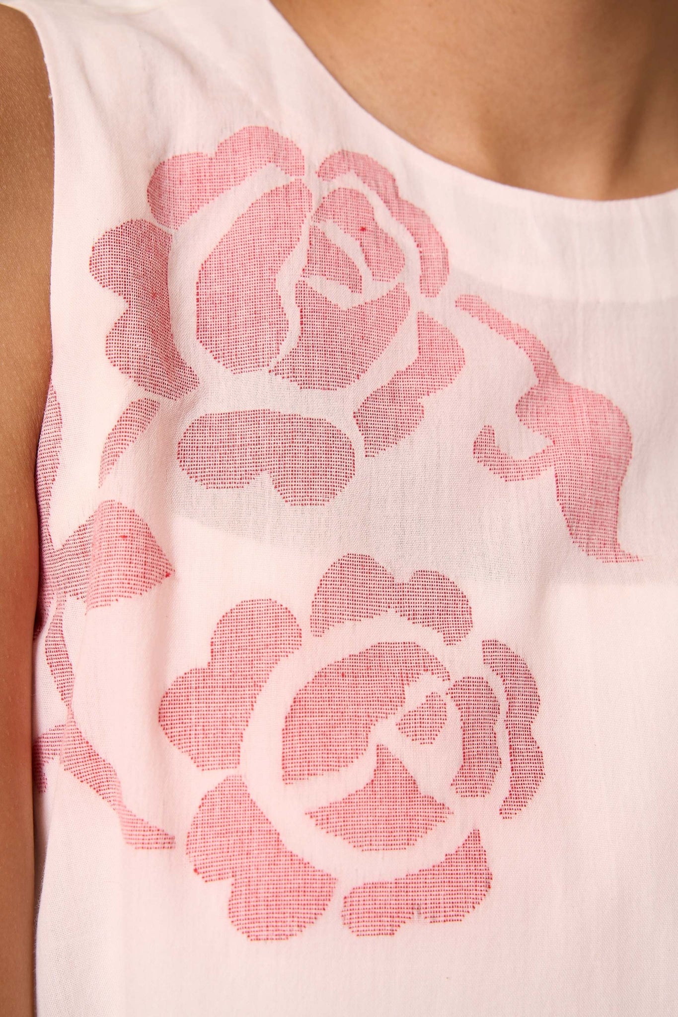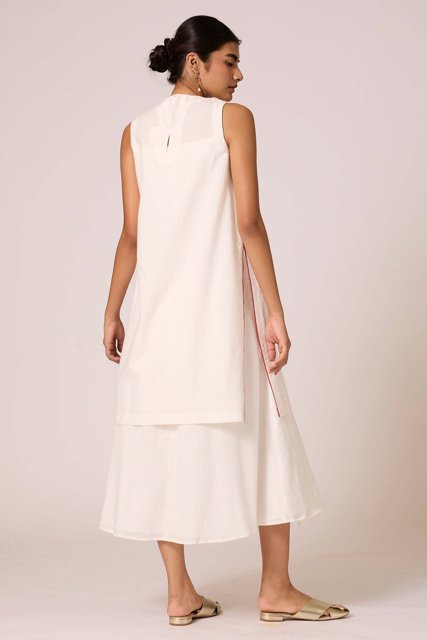 Sleeveless overlay in handwoven Jamdani fabric. Closed round neck. High side slits featuring selvage detail. Loop button fastening at the back. An effortless blend of style and elegance.