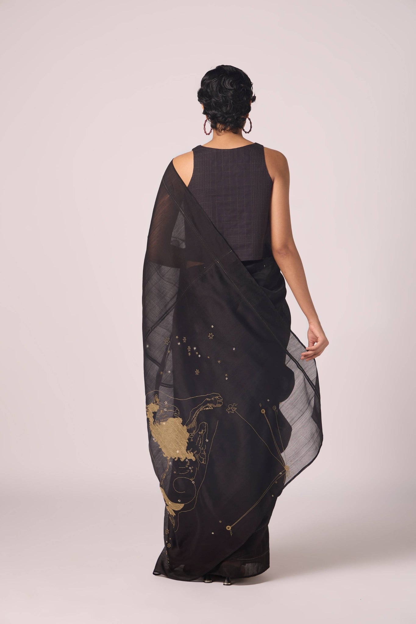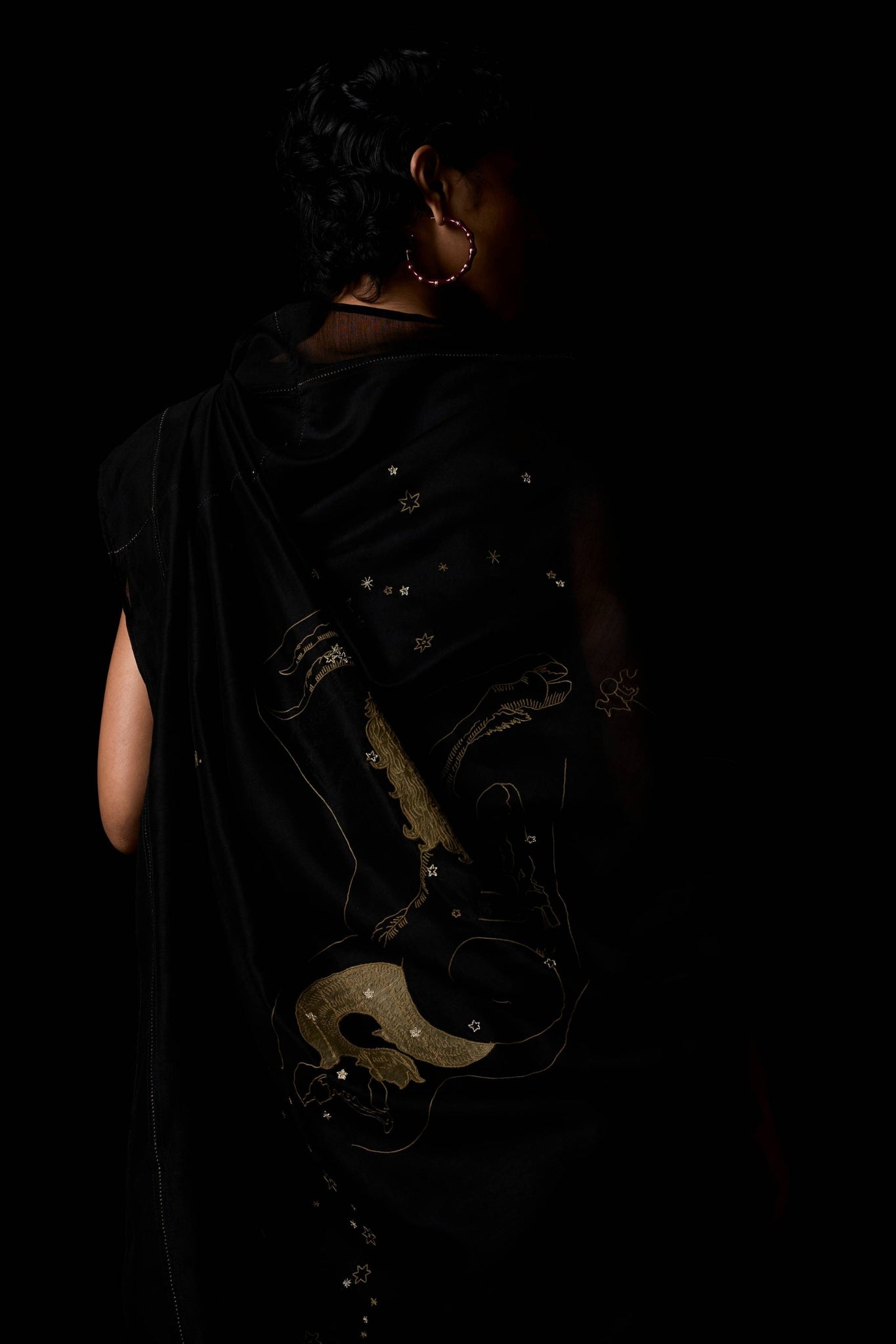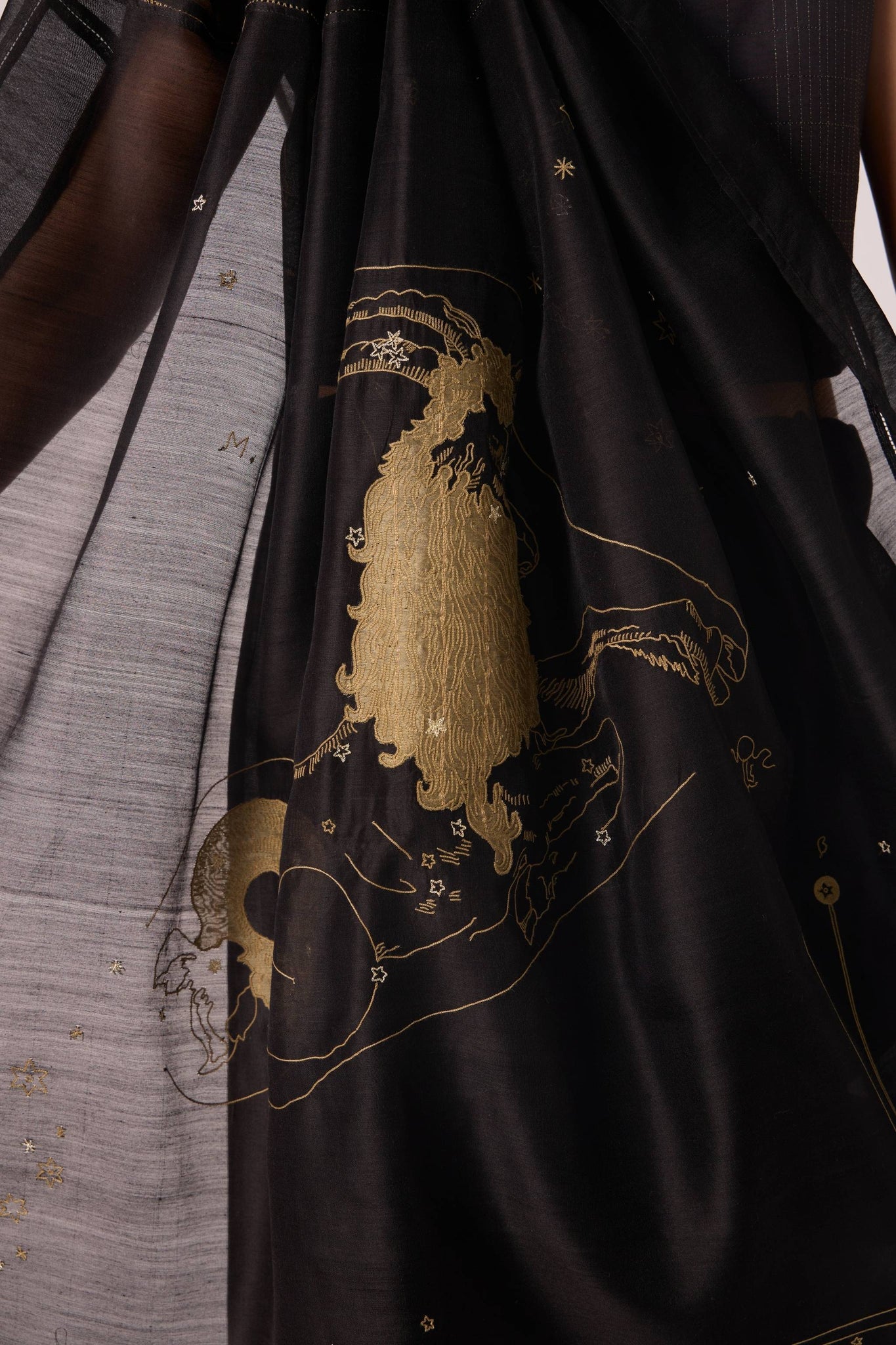 Chanderi becomes the sky where your zodiac shines. Sheer, luminous, and intimate in craft, the Zuben sari is as much an heirloom as a garment. Customised to your personal star sign.